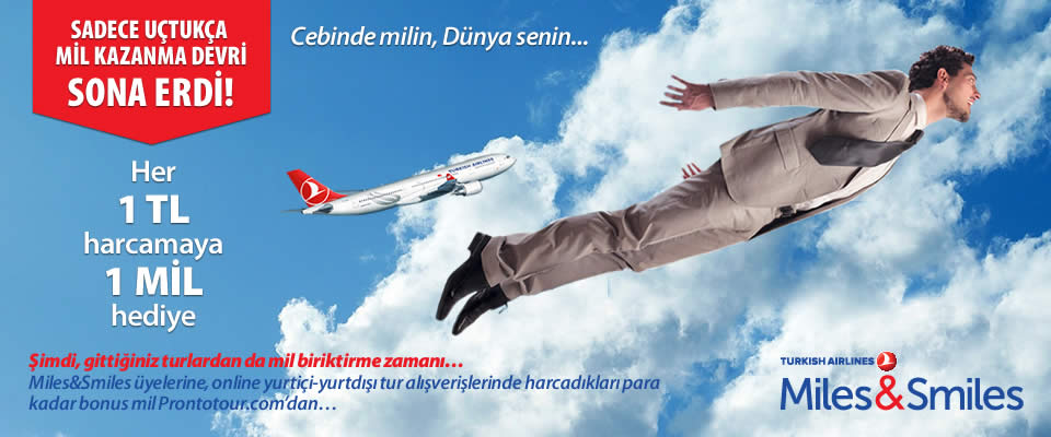 Miles&Smiles üyelerine, online yurtiçi-yurtdışı tur alışverişlerinde harcadıkları para kadar bonus mil Prontotour.com’dan… Cebinde milin, Dünya senin.