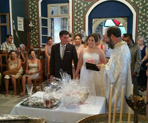 | Restorasyonu yeni yapıldığı duvarlardaki resimlerden belli olan küçük ama tarihi kiliseyi tıklım tıklım dolduran davetliler en az damat ve gelin kadar heyecanlı ve mutlu. Tören sırasında çiftlerin başına atılan pirinçler de, damadın sırtına atılan yumruklar kadar çoktu. Oldukça ağdalı dualar ve ilahilerle yarım saat sonra dini nikah töreni tamamlandı. |
